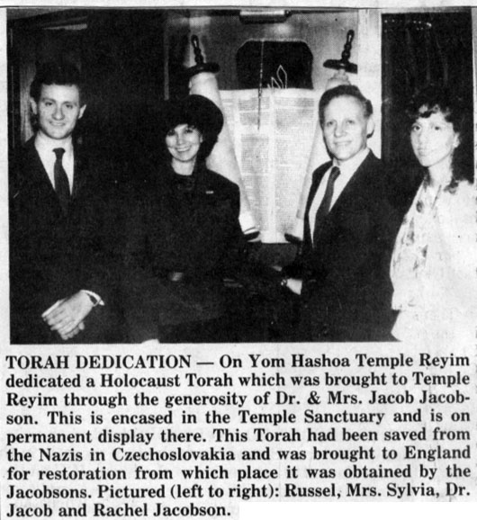 The scroll came to us through the efforts of our members Sylvia and Jack Jacobson. It was dedicated in a moving ceremony on Yom Hashoah in 1987 that included an address by Holocaust survivor Jacob Birnbaum, remarks by Rabbi Phillip Kieval, and musical selections by Cantor Marty Robbins and the children of the religious school.